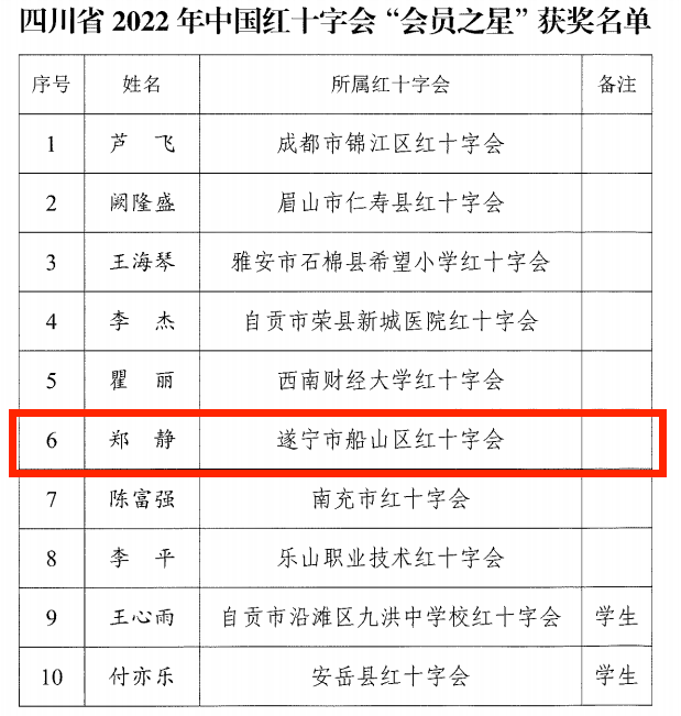 我院郑静同志荣获四川省2022年中国红十字会“会员之星”荣誉称号,是遂宁市唯一一个获得者。