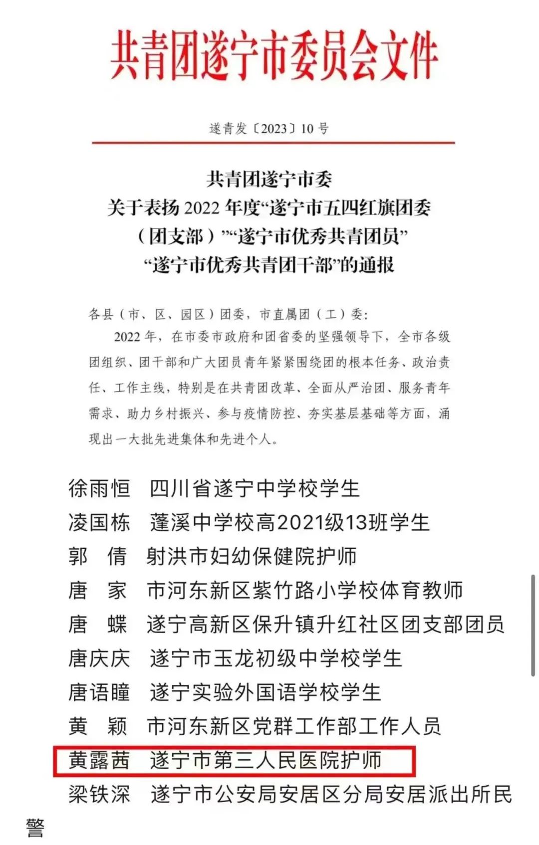 我院黄露茜同志荣获“2022年度遂宁市优秀共青团员”。