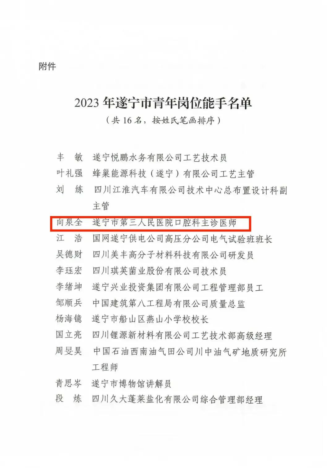 我院向泉全同志荣获“2023年遂宁市青年岗位能手”。