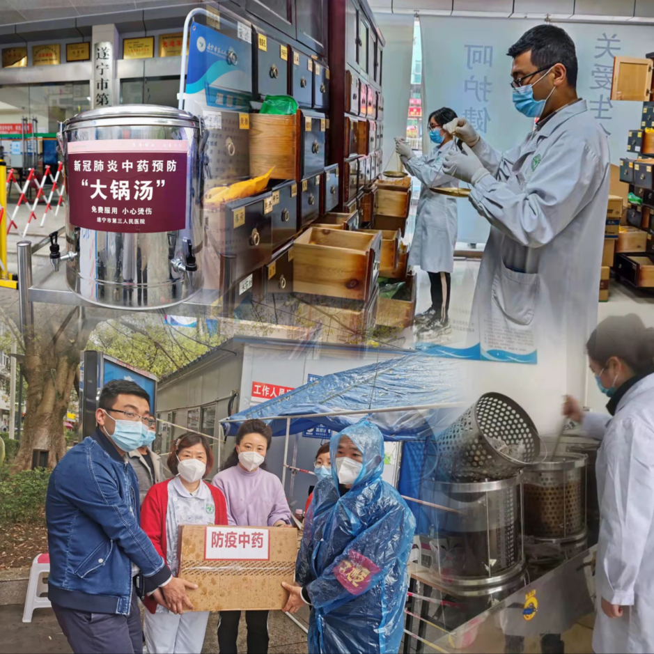 中药房和煎药室紧急熬制新冠肺炎中药“大锅汤”,为市、区疫情防控指挥部工作人员、社区工作人员及志愿者发放,同时在医院本部和裕丰园设置中药大锅汤自取点,每天为全院职工、病院和家属免费发放。