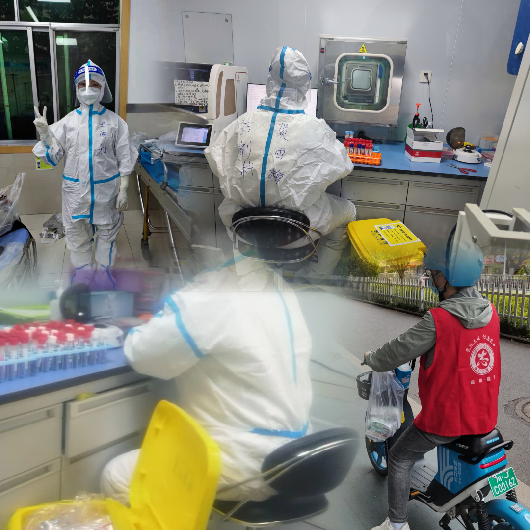科室人员主动请战,化身“大白”,奔赴核酸采集点,参与协助核酸采集工作。为了让核酸报告早一点出来,在医院统一安排下,药剂科抽调人员紧急支援检验科核酸检测工作。