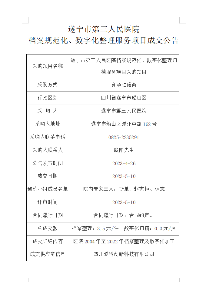 遂宁市第三人民医院档案规范化、数字化整理服务项目成交公告