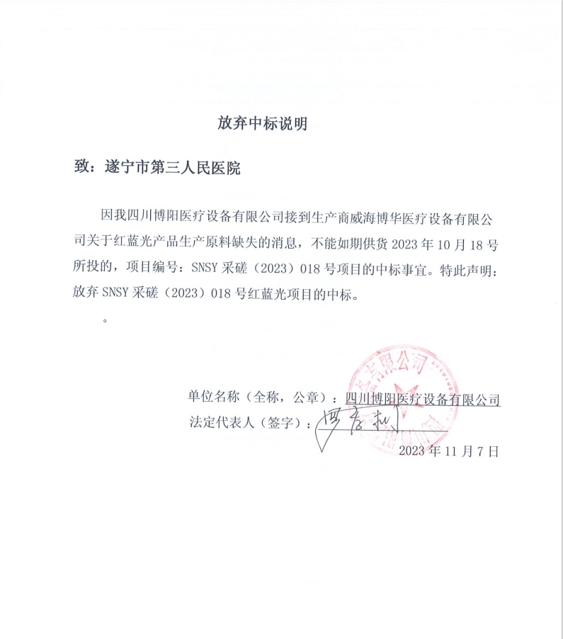 因第一中标候选人四川博阳医疗设备有限公司弃标并向我院发出弃标函,根据《中华人民共和国招标投标法实施条例》第五十五条以及《政府采购法实施条例》第四十九条的规定,在第一中标候选人拒绝签订合同或者弃标的情况下,撤销其第一中标候选人资格,顺延原第二中标候选人四川鸿麦贸易有限责任公司为中标人。