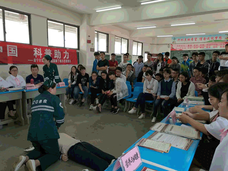 为进一步弘扬志愿服务精神,提高青少年健康素养,普及急救知识及技能,4月28日,我院南丁格尔志愿服务队一行14人在护理部主任唐素华的带领下走进了遂宁走进遂宁绿然国际学校,开展“健康中国 科普助力”主题志愿服务活动。此次活动由护理部及客服部牵头组织,主要从青少年健康行为与生活方式、孝心照护老人、现场急救知识等三方面开展健康知识讲座和技能培训。志愿服务队的前期精心准备,为300多名师生带来了一场别开生面的健康教育,同时也为师生们带去了跳绳、健康体重速查卡、健康科普扑克卡片、限盐勺等健康用具,提供常见疾病科普及眼保健等现场咨询服务。