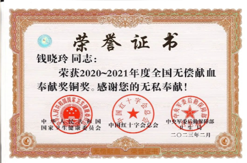 钱晓玲、黄洪涛、杜威、谢勇获“全国无偿献血奉献奖铜奖”。