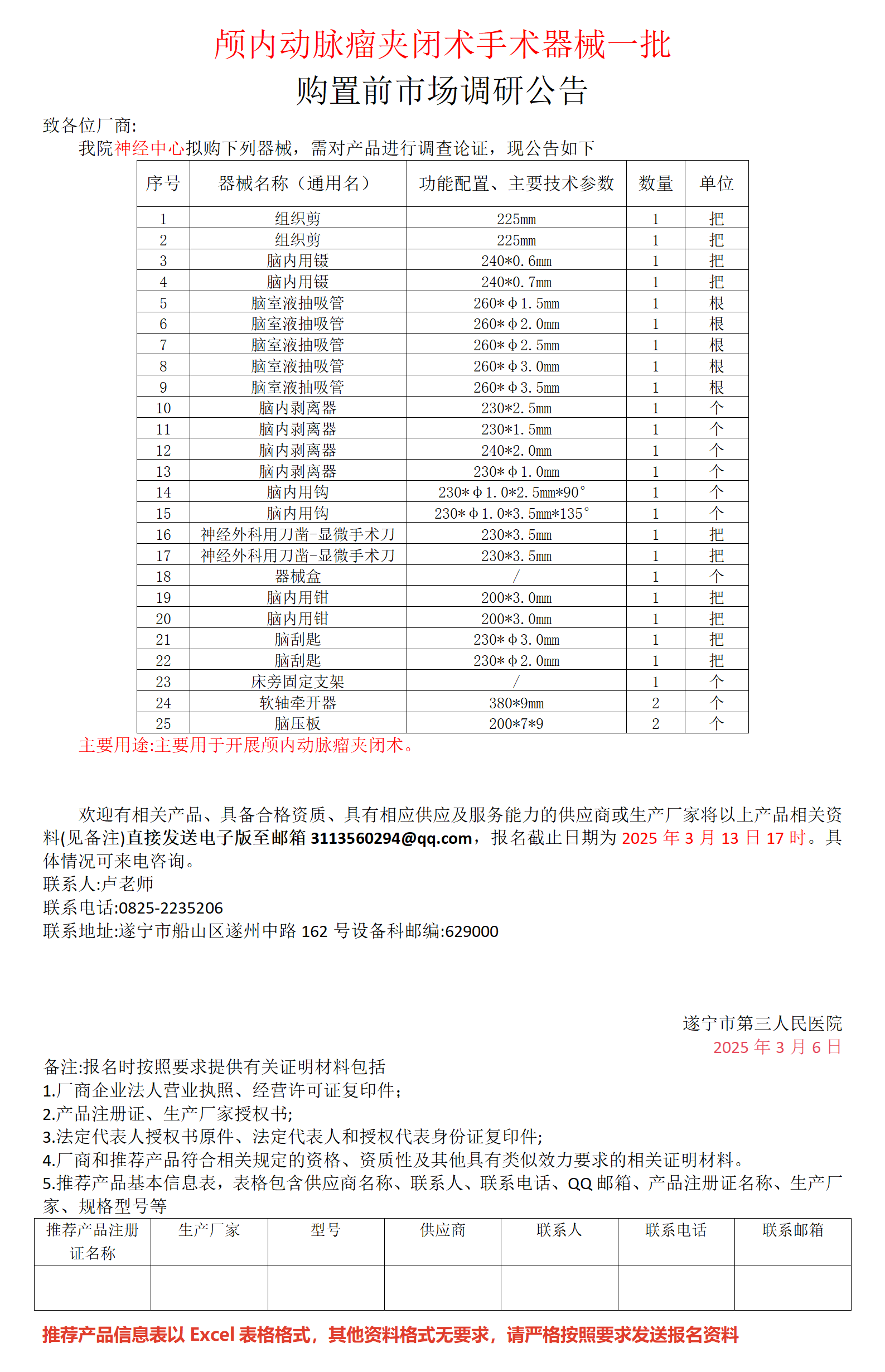 颅内动脉瘤夹闭术手术器械一批 购置前市场调研公告