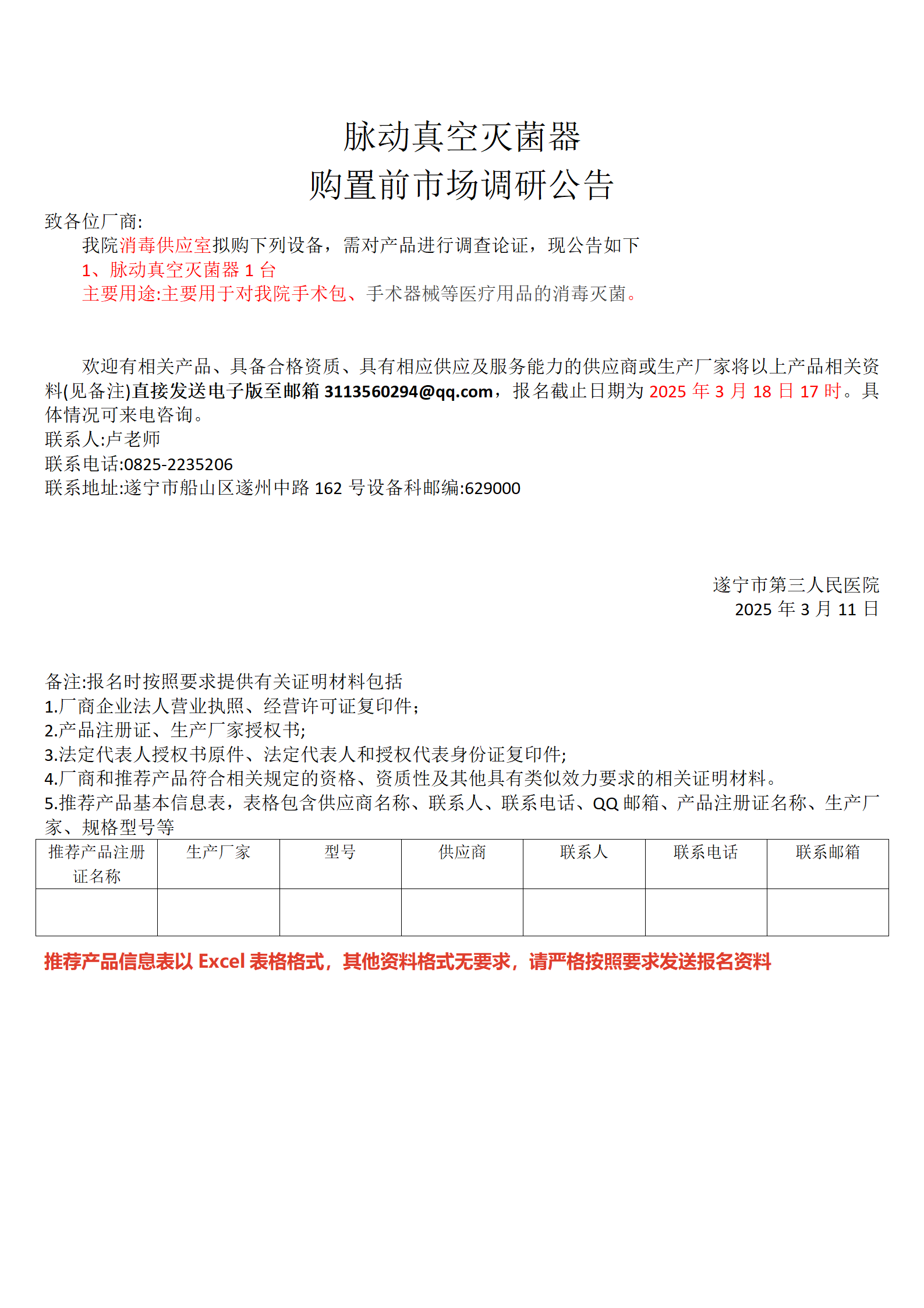 脉动真空灭菌器 购置前市场调研公告