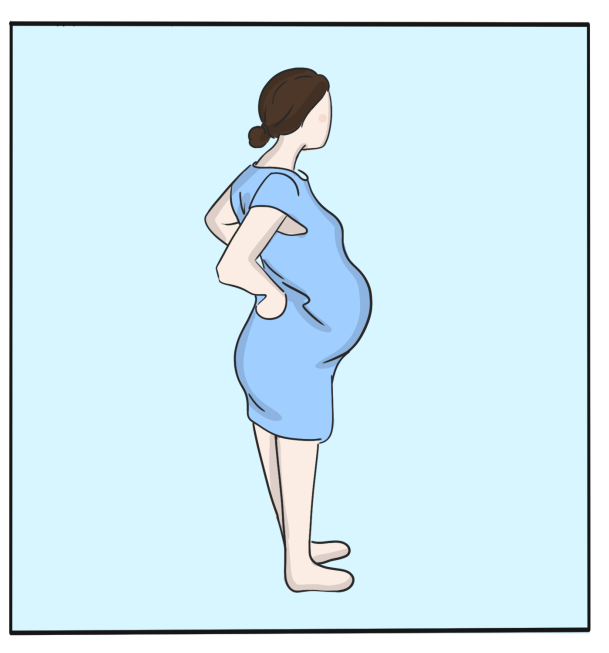 孕晚期,随着胎儿生长,孕妇重心前移,骨盆开始前倾。为保持身体平衡,孕妇的头和肩会向后仰,腰部向前挺形成典型的孕妇姿势。