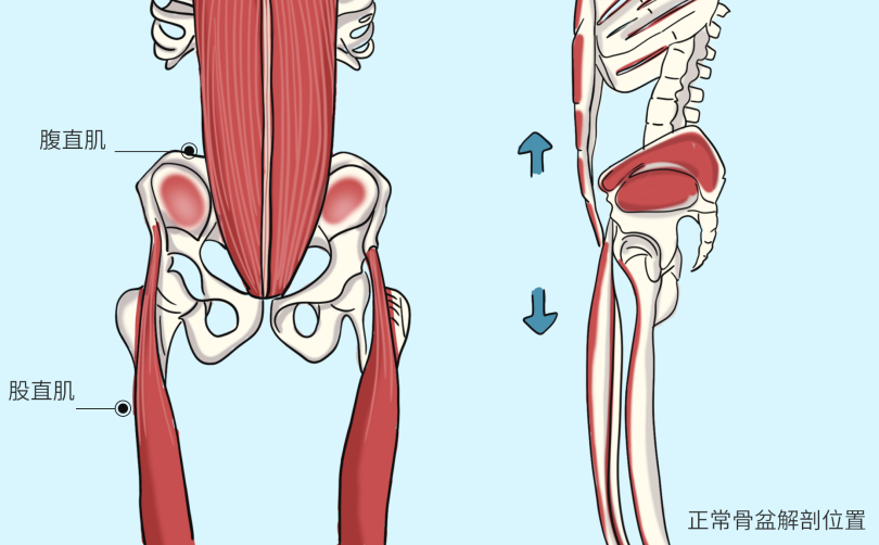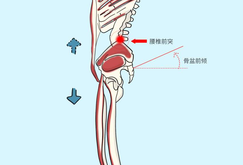 产后腹直肌松弛,力量减弱,骨盆在股直肌的拉力下发生骨盆前倾,使得腰椎前突。破坏了腰椎正常生理弧度,引起腰部疼痛。