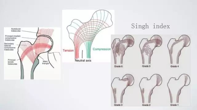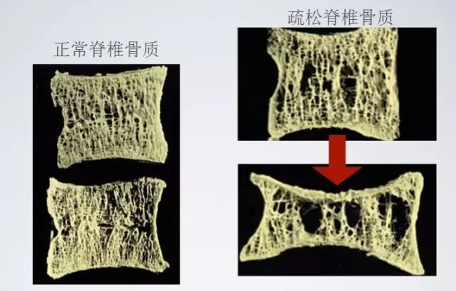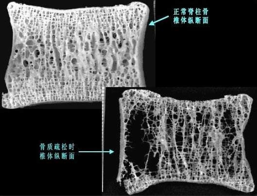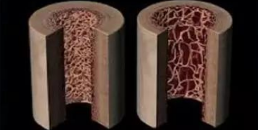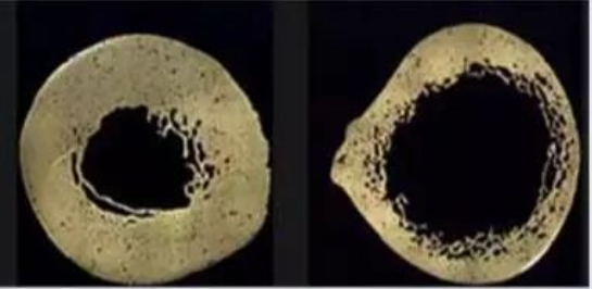 如上图所示,切开长条型的骨头会看见这个情况,左边是正常的皮质骨切面,右边是骨质疏松皮质骨切面。