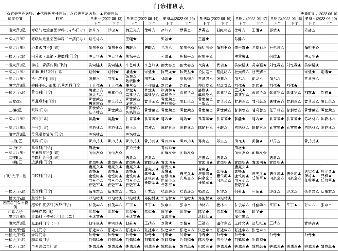 门诊坐诊时间表来了!