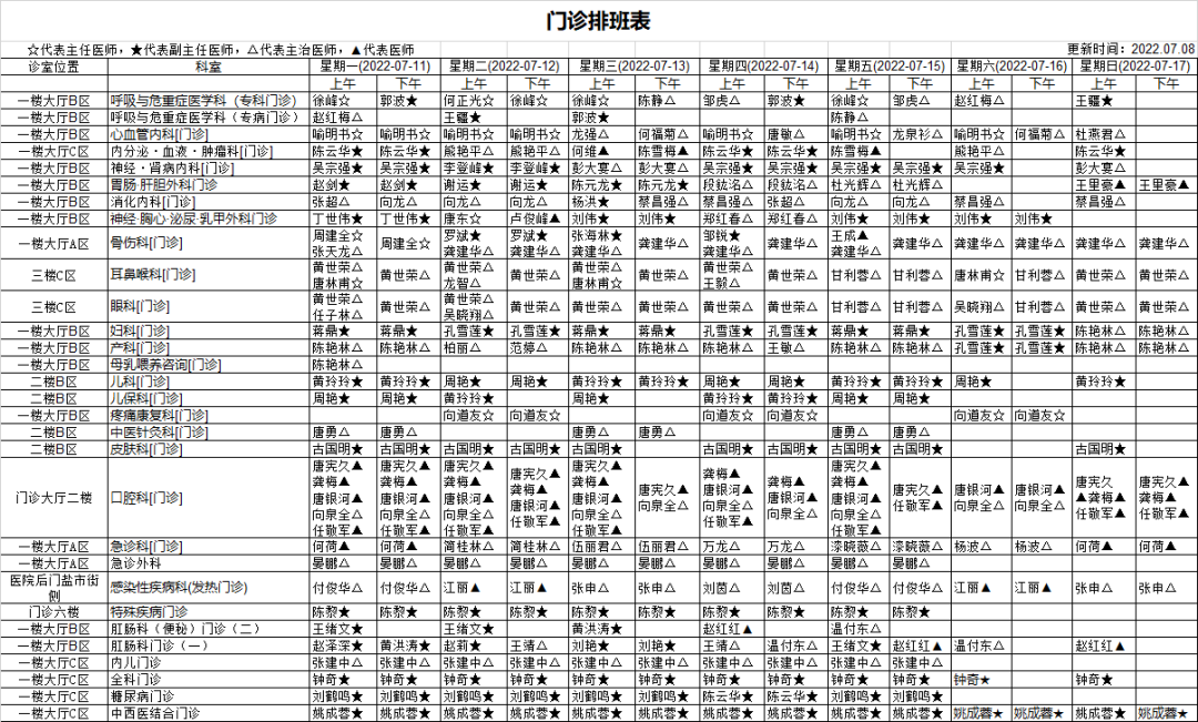 门诊坐诊时间表来了!