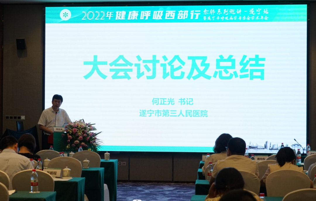 在会议闭幕式上,何正光进行会议总结,首先他对中国人体健康科技促进会将健康呼吸西部行学术活动定在遂宁,由市医学会呼吸专委会牵头,市三人民医院具体承办及学术会会务筹备组的高效组织表示了感谢,通过短短1天多时间的学术会议,让本地医务人员对COPD、支气管哮喘等气流受限性疾患、间质性肺疾患、肺结节管理、胸膜疾病、支气管扩张症及睡眠呼吸疾患等呼吸系统疾患的最新知识有了比较全面的了解,感谢莅临本次大会的刘春涛教授、唐向东教授以及省内外呼吸学科知名专家教授带来的精彩课程,让现场和线上参会者受益匪浅。