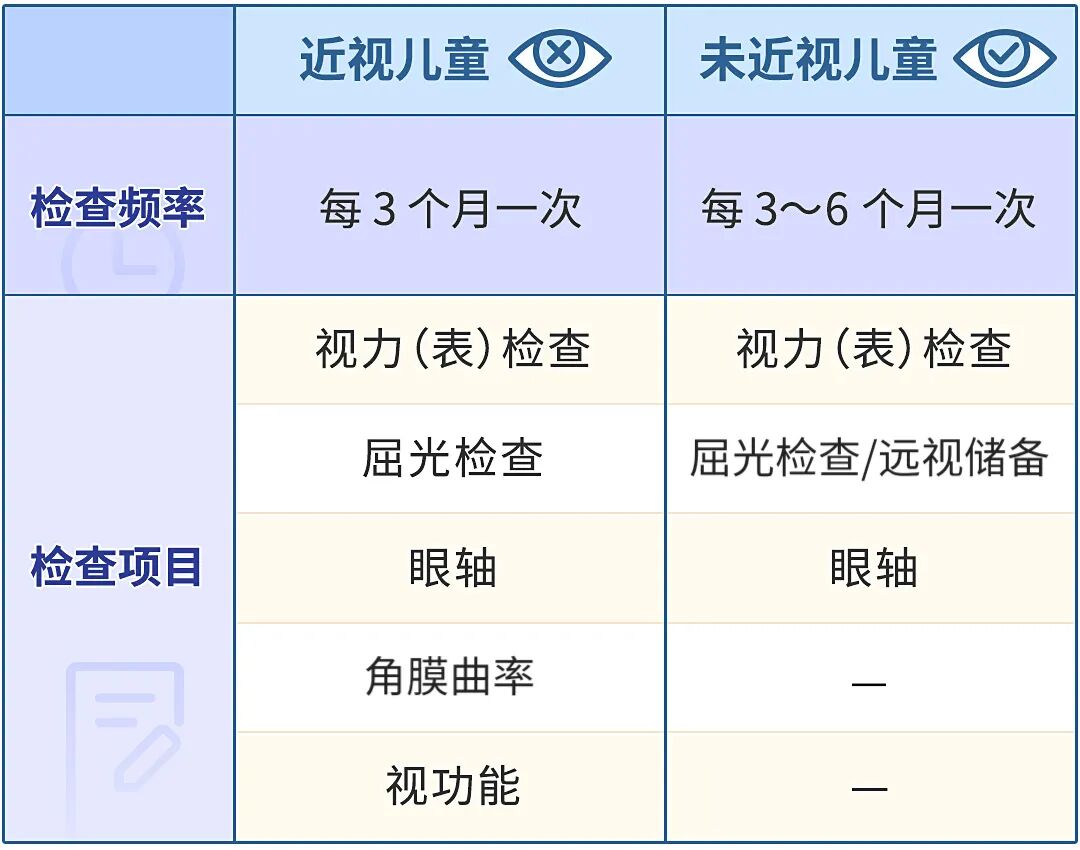 一般来说没有近视的孩子可以每 3~6 个月进行一次眼睛检查。如果大家能够在孩子没有近视时做好眼睛的定期检查,就能提前知道孩子的近视倾向并加以控制,进而可能避免孩子近视发生。