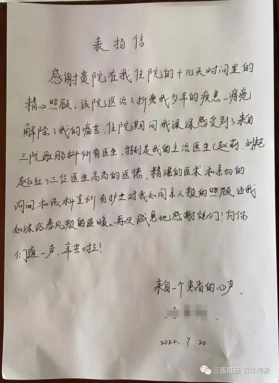 李女士康复出院后为表达感激之情,特意将一封诚意满满的感谢信送到肛肠科医生办公室,并再三强调“认识赵医生太晚了,早来遂宁市第三人民医院就好了,就不用被痔疮折磨这么多年,多谢赵莉医生、刘艳医生、赵红红医生以及消化中心肛肠科全体医护人员精心诊治和贴心的照顾,让我摆脱病痛的折磨!"