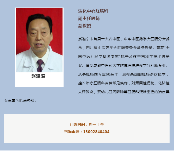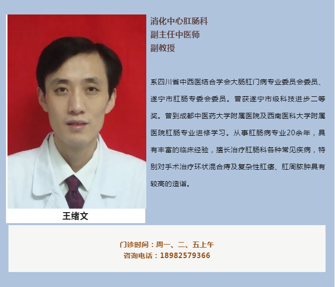 系中华中医药学会肛肠专委会委员,中国女医师协会肛肠专委会委员,四川省中医药学会肛肠专委会常务委员,四川省中西医结合学会大肠肛门病专委会常务委员,遂宁市肛肠质控中心副主任。被中华中医药协会授予“全国中医肛肠名专家”称号,中国西南西北肛肠协会授予“中国西部肛肠名医”。先后到成都中医药大学附属医院、川北医学院附属医院肛肠专业学习。从事肛肠病专业20余年,具有丰富的临床经验,擅长治疗肛肠科各种常见疾病,尤其擅长以微创无痛技术治疗肛周常见病、多发病,对肛周坏死性筋膜炎、复杂性肛瘘及肛门畸形、便秘等肛肠科疑难杂症的治疗亦有独到之处。