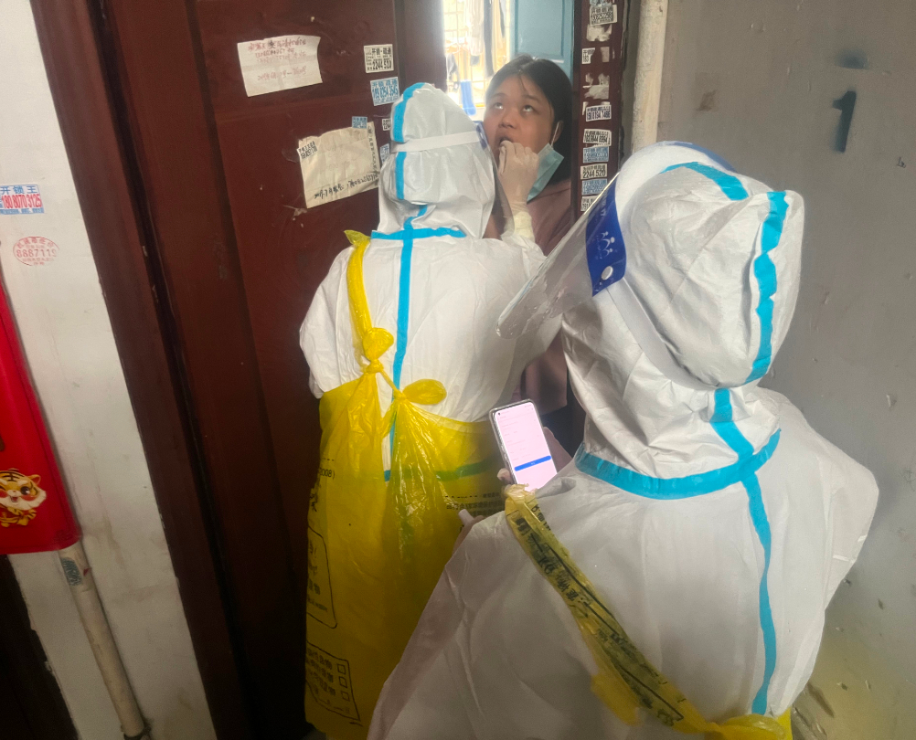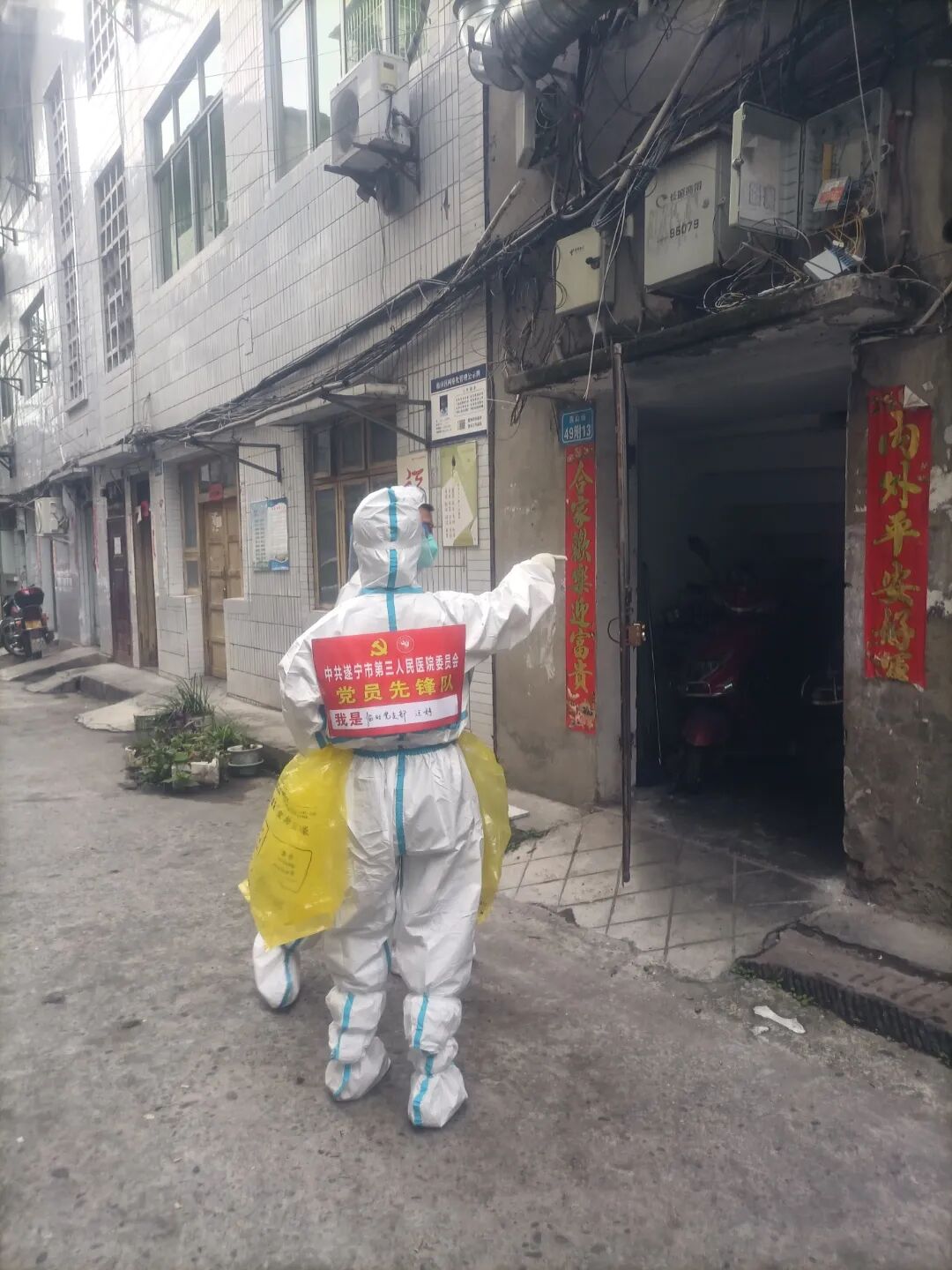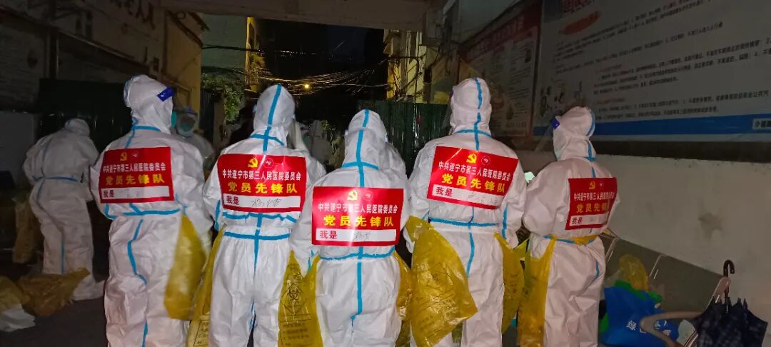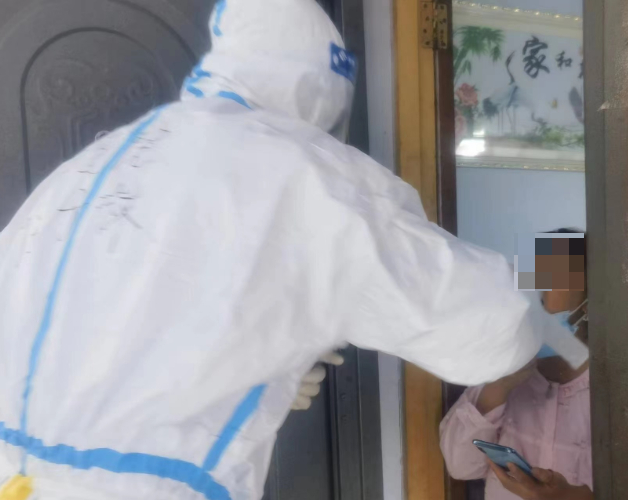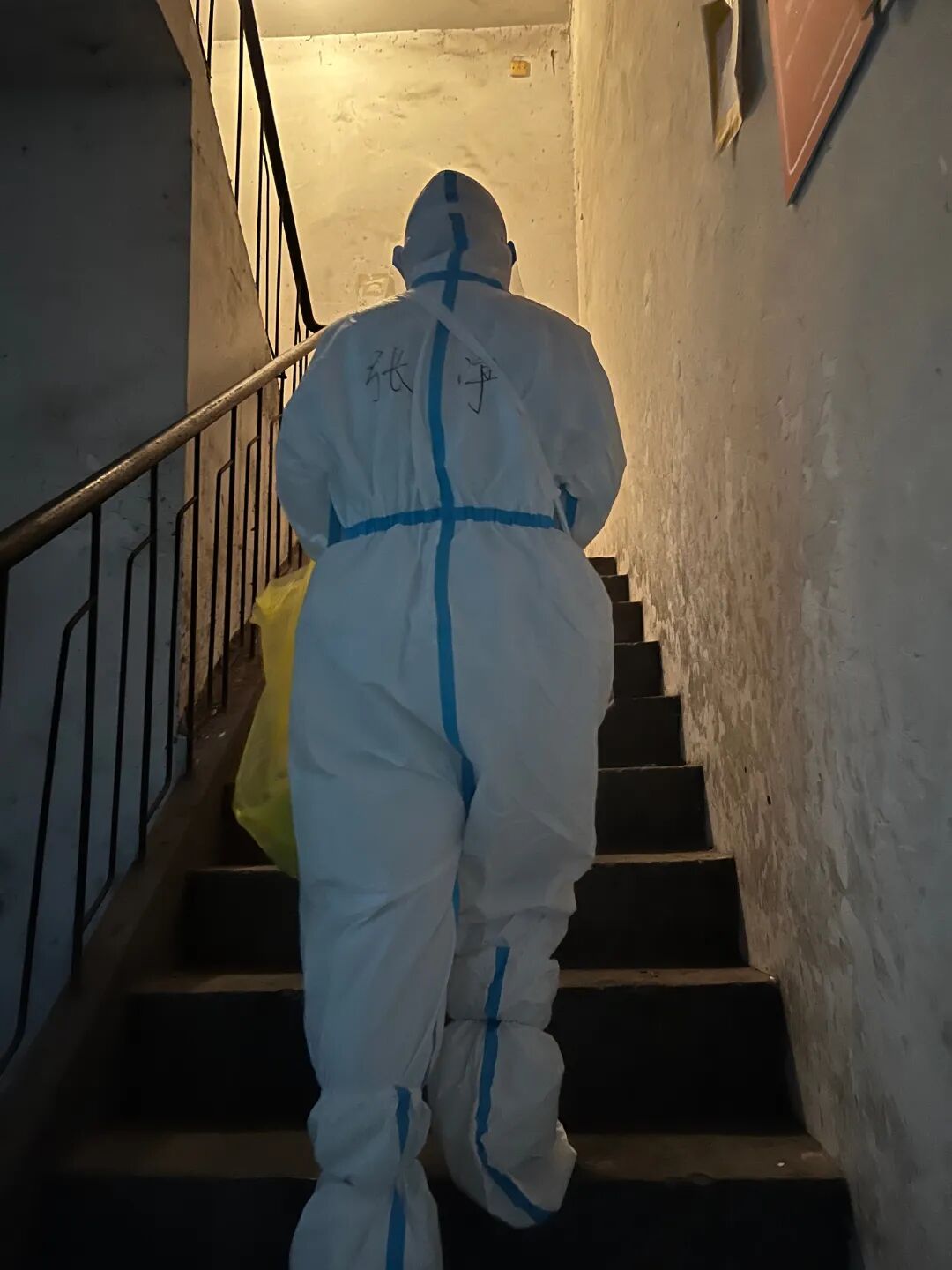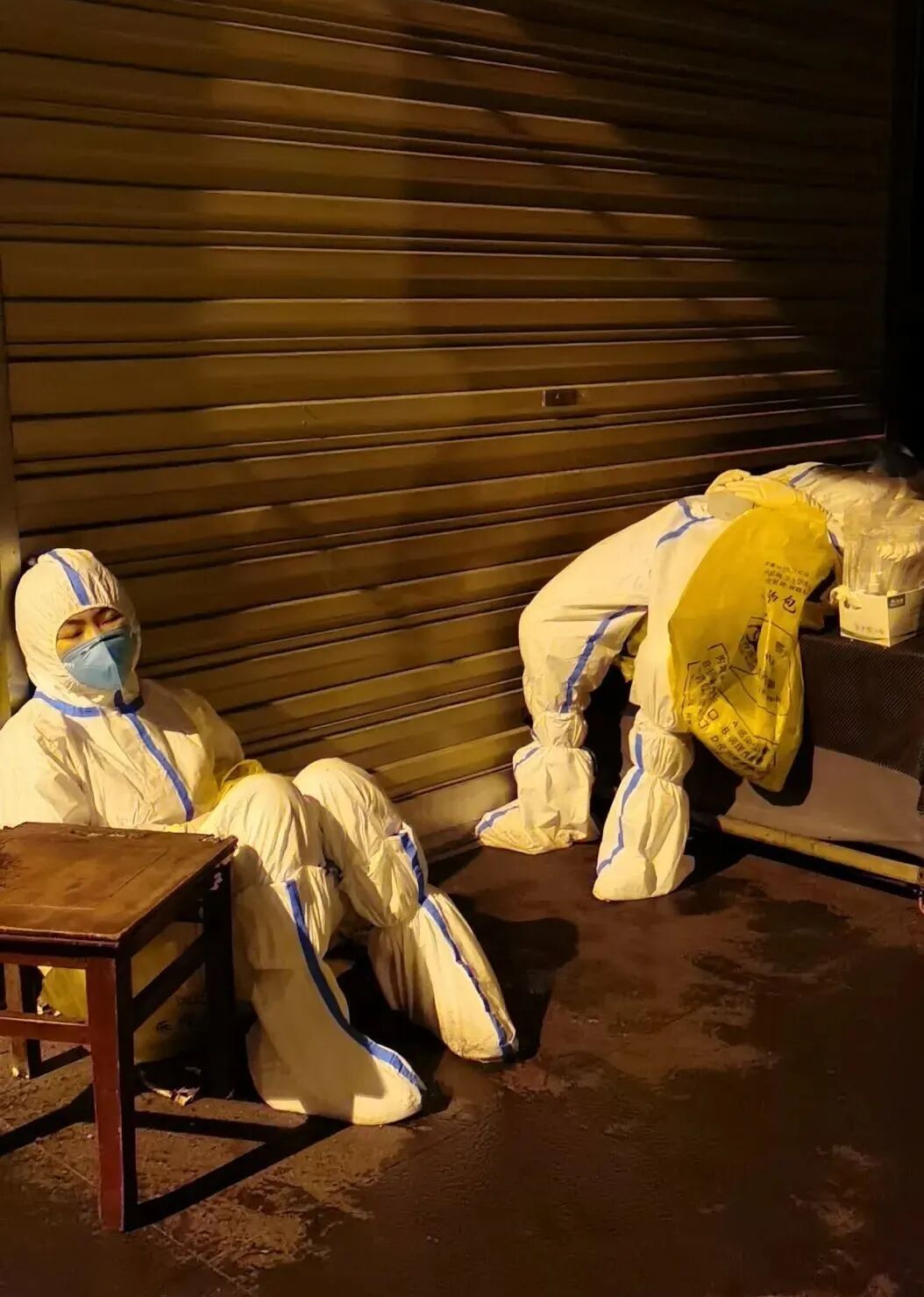 每日凌晨3、4点,当你还在睡梦中,临时党支部各核酸采样组已开始相关准备工作。即使裹着笨拙的防护服,戴着乳胶手套、护目镜和N95口罩,他们也能把入户范围和时间精准到每一户和每一个时间段,一层一层爬、一栋一栋过、一户一户测,确保做到不漏一户一人,耐心细致地为居民采集核酸样本、录入信息。采集完,他们常常是累到瘫软,靠在椅子上、墙上就能睡着,中午因为采集任务,时常错过正常饭点,然而却没有一个人叫苦叫累。