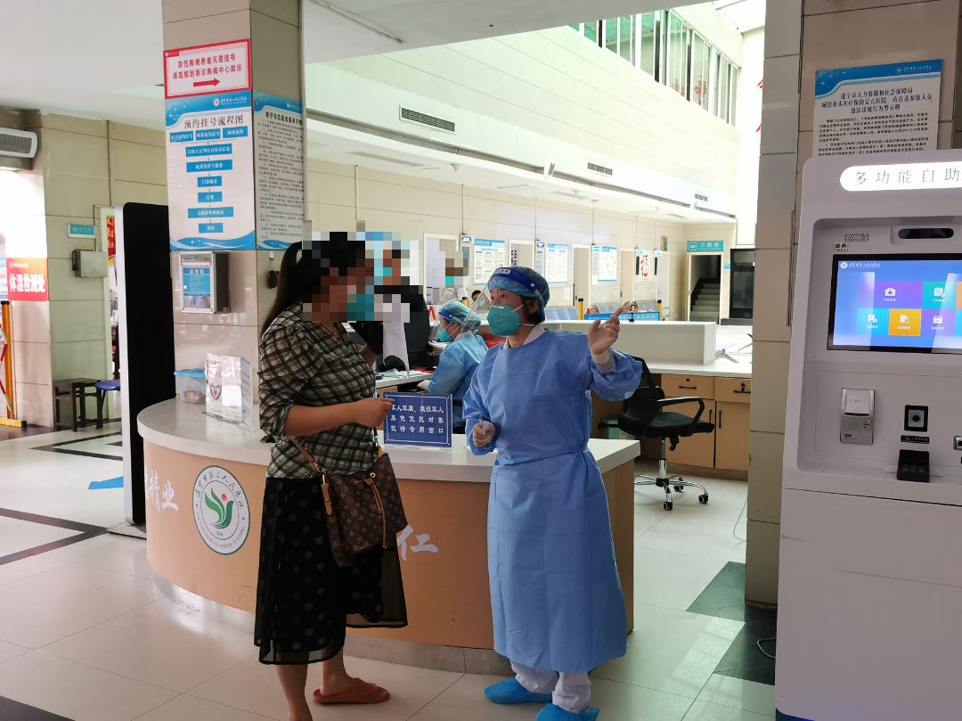 在挂号、取药窗口等人员易聚集点位,导诊人员、志愿者、保安人员提醒大家保持安全距离,共同维持良好就医秩序。