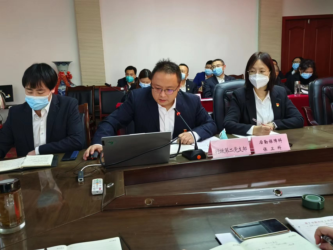 行二党支部书记卢奇汇报支部工作情况;财务科,信息科,设备科(物质管理科),基建科,后勤保障科、保卫科、公卫科、采购办负责人分别从科室重点工作推进情况、存在问题、下一步工作计划及廉政风险点梳理等方面进行了详细汇报。