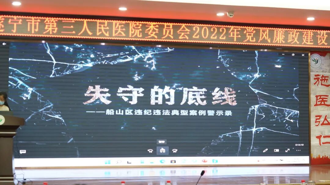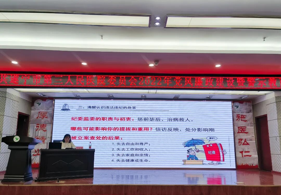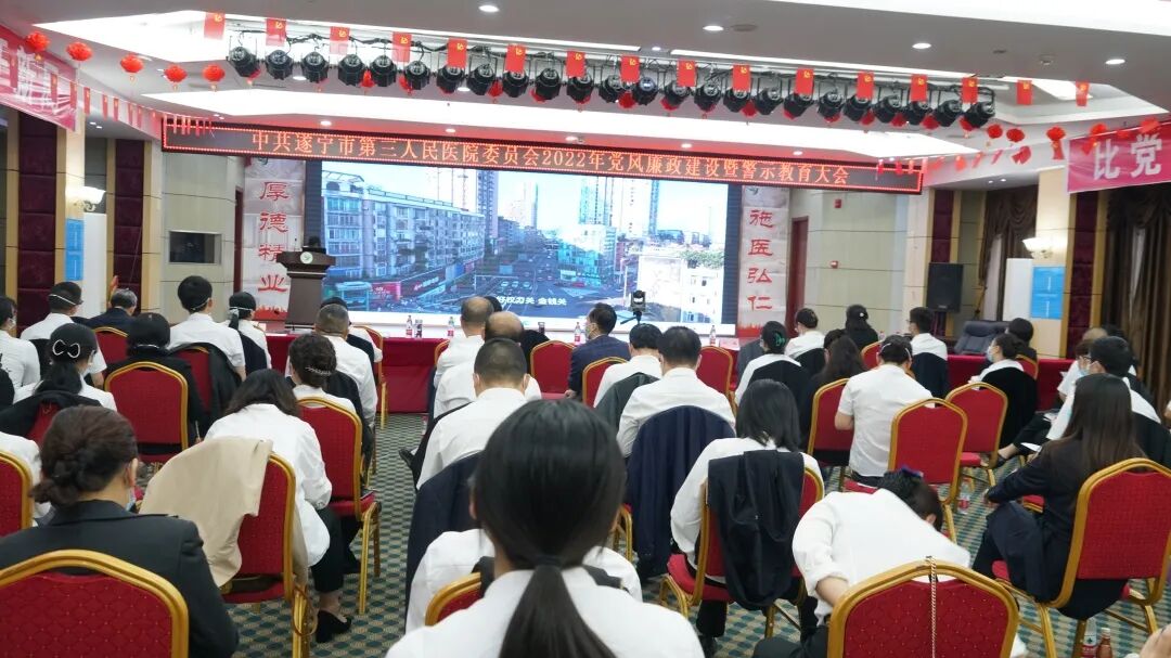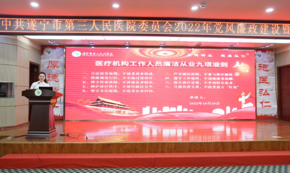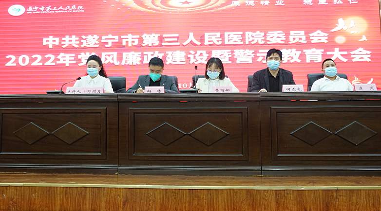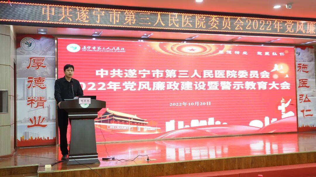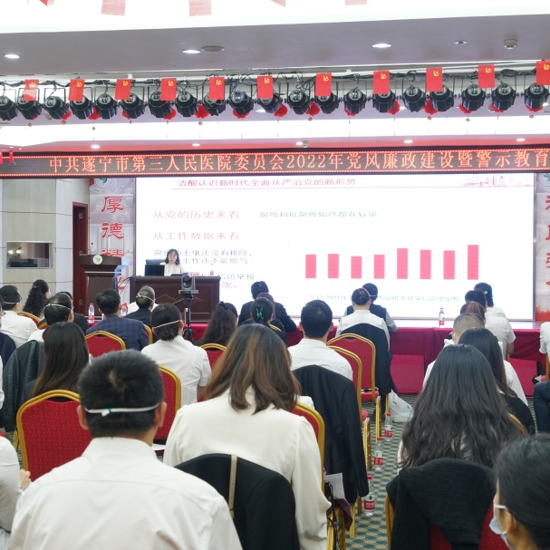 为贯彻落实习近平总书记在“二十大”报告中提出的“坚持以严的基调强化正风肃纪,坚决打赢反腐败斗争攻坚战持久战”的要求。今日下午,我院党委组织召开2022年党风廉政建设暨警示教育大会,区纪委副书记、区监委副主任景丽娜,区卫健局党委委员、遂宁市第三人民医院党委书记何正光,区卫健局党委委员、区纪委监委驻区卫健局纪检监察组组长向椿,院党委副书记、院长康东以及医院院级领导,各支部书记及纪检委员,护士长及以上中层干部代表参加会议,本次会议由纪委书记、工会主席邓鸿月主持。会议采取线下+线上钉钉同步直播的方式召开。