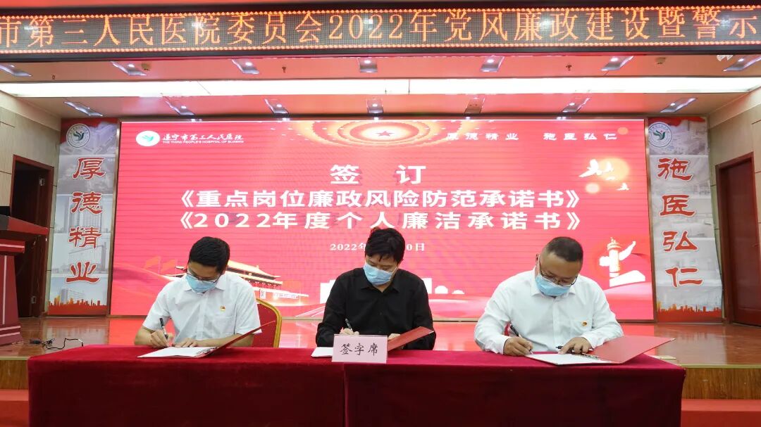 何正光与重点科室负责人代表签订《遂宁市第三人民医院重点岗位廉政风险防范承诺书》,科室负责人现场签订《个人廉洁承诺书》。