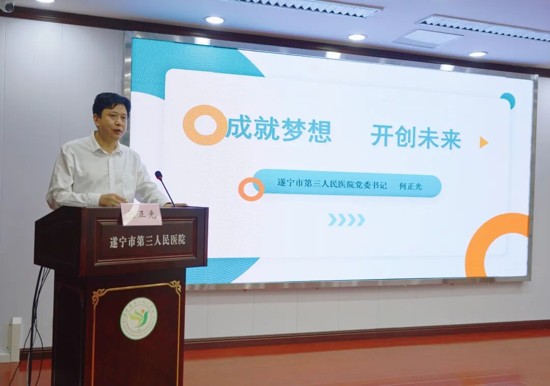 党委书记何正光首先代表医院对所有新员工的加入表示最诚挚的欢迎,围绕"成就梦想 开创未来"这一主题,从医院的历史沿革、人才队伍建设、专科建设、发展愿景等方面讲述了我院的发展现状和战略规划,同时,寄语新市三医人:当前,医院正处在转型升级、提质增效、高速发展的关键时期,国家三级综合医院平台已然搭建,创等达标工作正在进行。希望你们能在市三人民医院这片沃土上,健康成长,肩负起医院发展的历史使命,早日成长为厚德精业、忠诚干净、有担当的新时代市三医人!同时希望大家以本次培训为起点,系好职业生涯“第一颗扣子”,在以后的工作中,德才兼备,以“清”为美、以“廉”为荣,不要迷失从医的初心,时刻自重自省!扣好人生的第一粒扣子,迈好人生的第一步台阶,行得端正,方能致远!