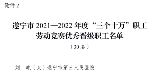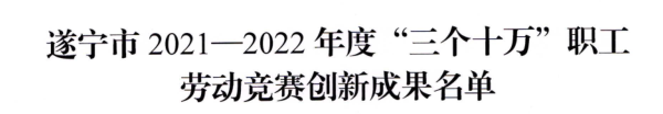 为充分发挥工人阶级主力军作用,团结动员遂宁市广大职工对标赶超、创新实干、奋勇争先,立足岗位、锤炼本领、建功立业,遂宁市人民政府发布关于表扬2021-2022年度“三个十万”职工劳动竞赛先进集体和先进个人的通报。