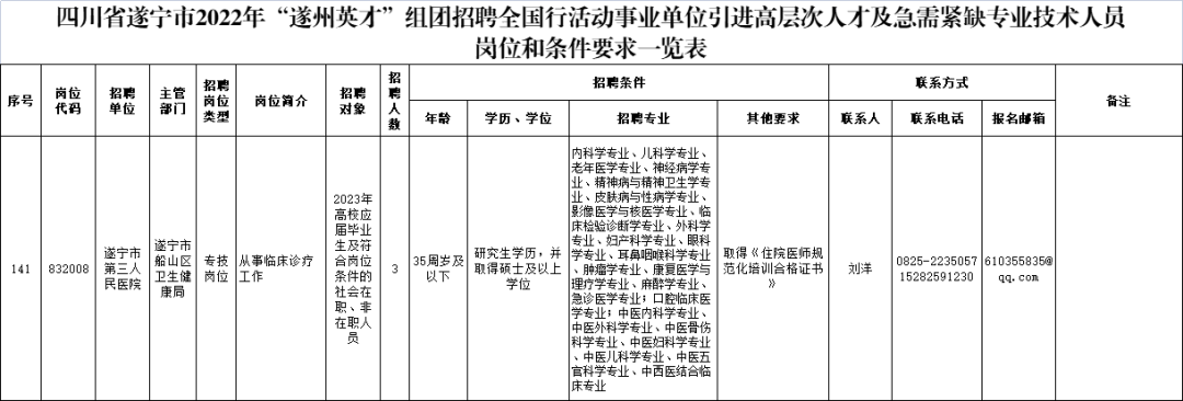 中共遂宁市委组织部、遂宁市人力资源和社会保障局决定开展2022年遂州英才”组团招聘全国行活动,遂宁市第三人民医院也将引进一批2023年高校应届毕业生及符合岗位条件的社会在职、非在职人员来院工作。现将有关事项公告如下: