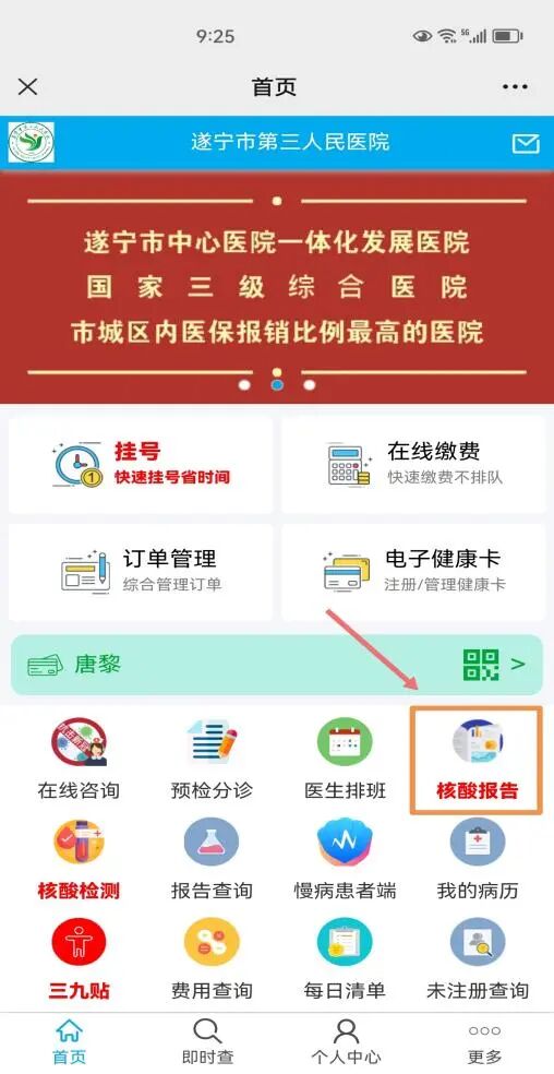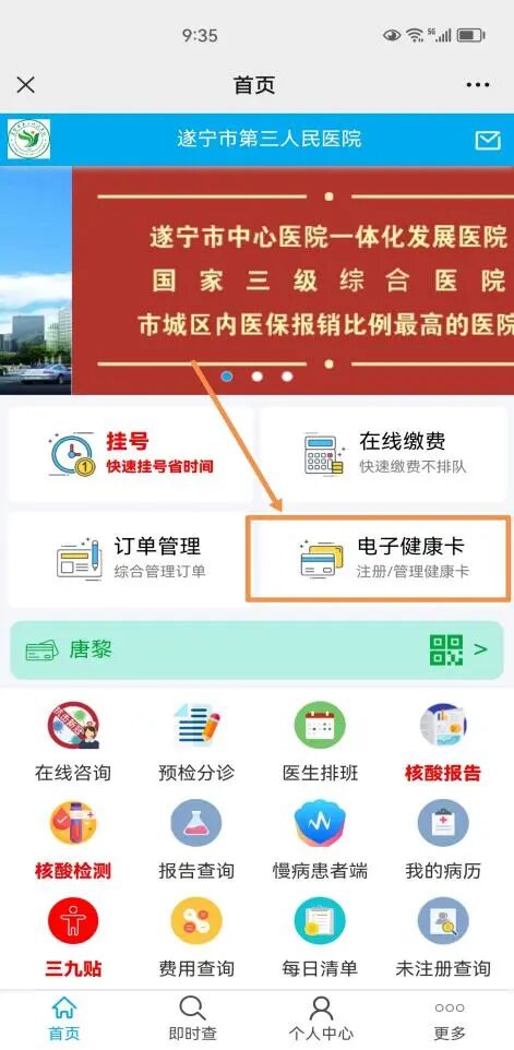 3.未在我院开通电子健康卡的用户,需要先建立电子健康卡。首页点击“绑注册电子健康卡”-“申请健康卡”,按照提示完成在线建卡流程。小程序首页点击“检验报告”,可以查询到在我院做过的核酸检测结果。
