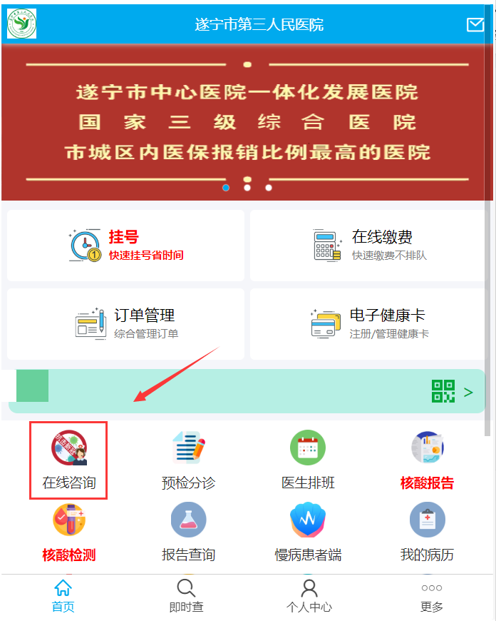 1.微信扫描以下二维码,关注“遂宁市第三人民医院”微信公众号。