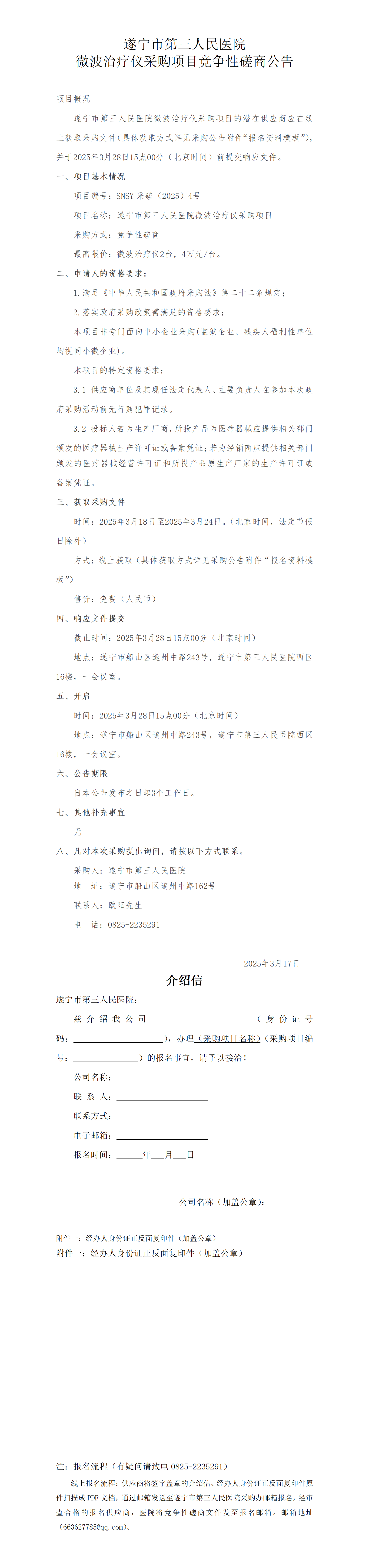 遂宁市第三人民医院 微波治疗仪采购项目竞争性磋商公告