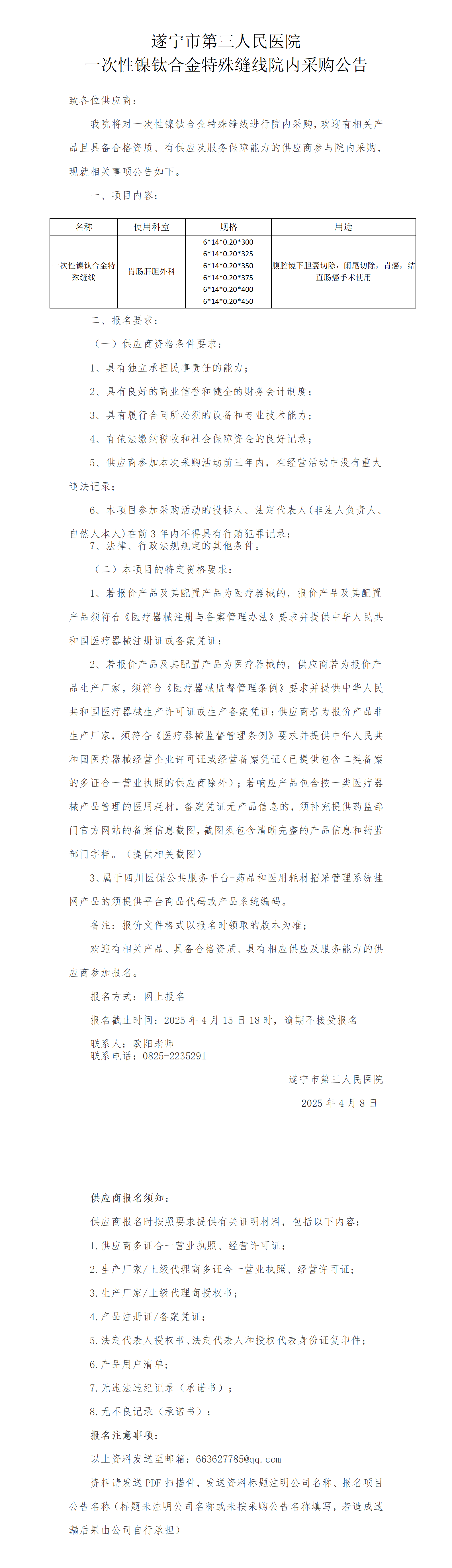 遂宁市第三人民医院 一次性镍钛合金特殊缝线院内采购公告