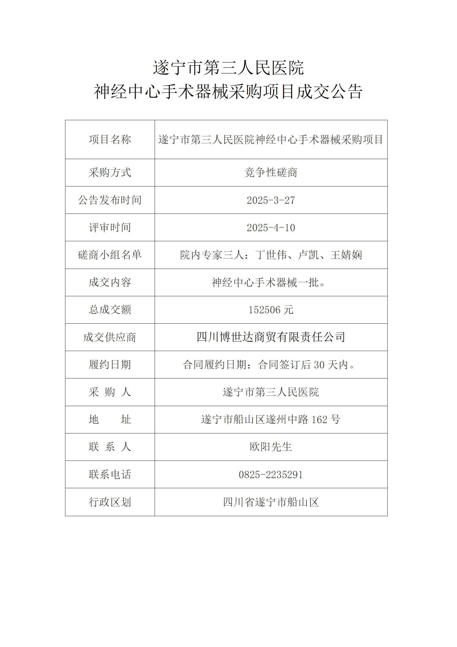 遂宁市第三人民医院 神经中心手术器械采购项目成交公告