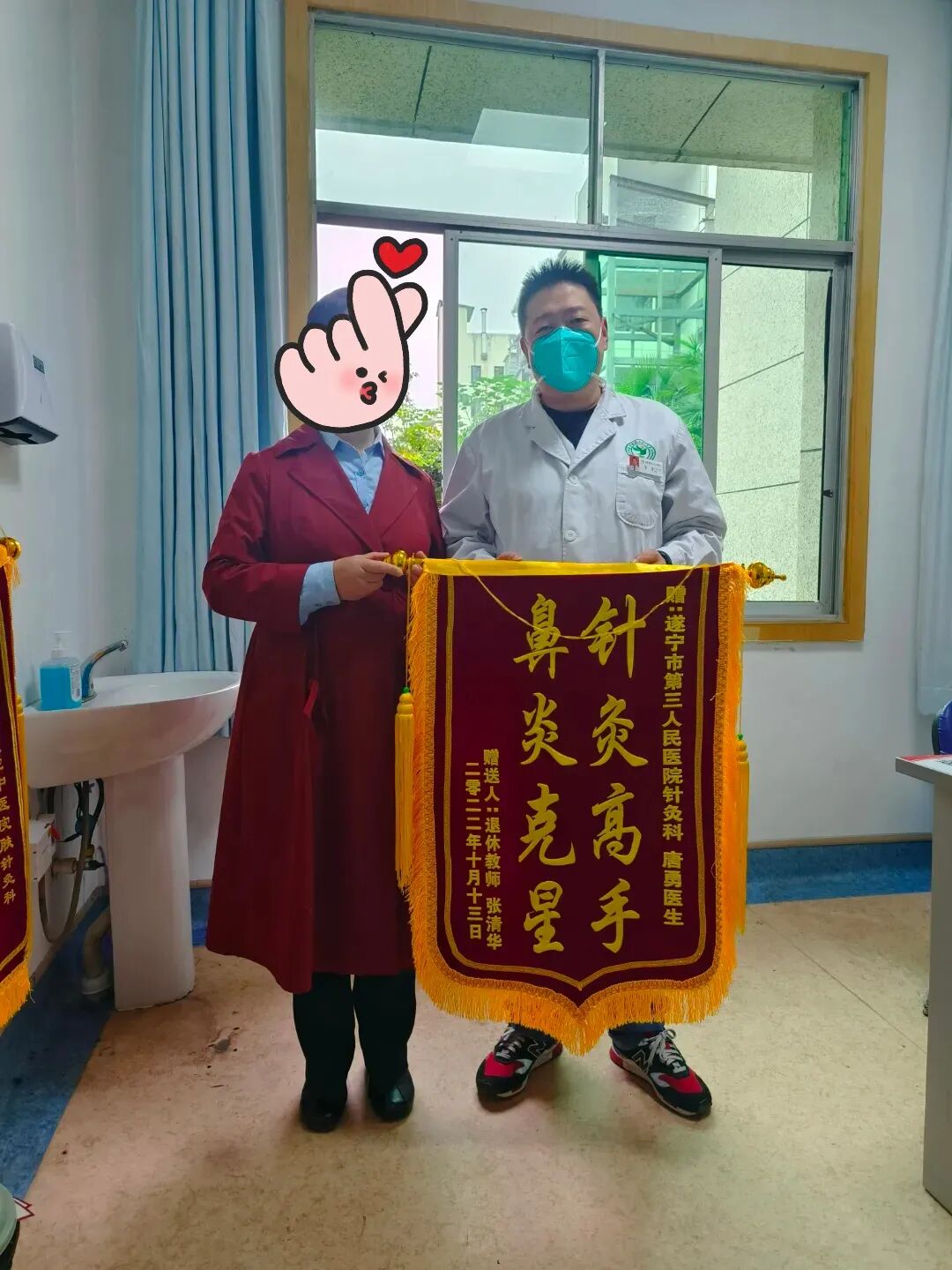 近日,张女士将一面写着“针灸高手 鼻炎克星”的锦旗送到我院中医·皮肤·针灸科主治中医师唐勇手中,再三感谢对中医·皮肤·针灸科医护人员精湛的医疗技术和优质贴心的护理服务。